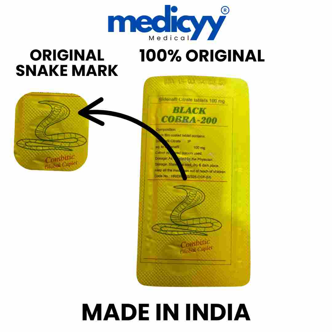 The active ingredient, sildenafil citrate, selectively inhibits phosphodiesterase type 5 (PDE5), an enzyme that breaks down cyclic guanosine monophosphate (cGMP) in the penis. By blocking PDE5, Black Cobra 200 Tablets promote smooth muscle relaxation and increased blood flow, facilitating stronger and longer-lasting erections. It is important to note that the medication requires sexual arousal to be effective and does not cause spontaneous erections. Effects typically begin within 30–60 minutes and last up to 4–6 hours.