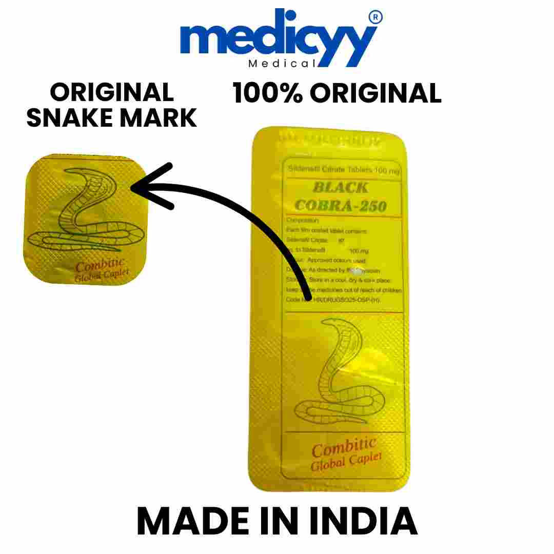 Black Cobra 250 Tablet is a prescription medication available in tablet form, containing 250mg of sildenafil citrate as its active ingredient. This formulation is manufactured by various pharmaceutical companies, with some sources indicating Combitic Global Caplet as one of the manufacturers. The medication is typically packaged in strips of 5 timing tablets, making it convenient for discrete storage and use.