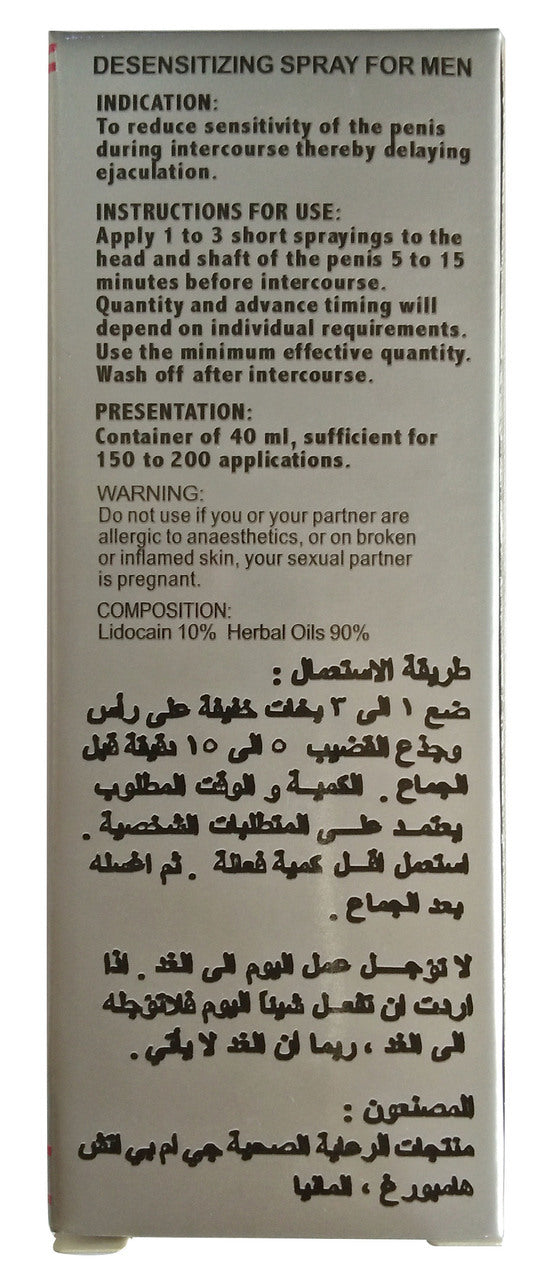 Apply 1 to 3 short sprays to the head and shaft of the penis 5 to 15 minutes before intercourse. Quantity and advance timing will depend on individual requirements. Use the minimum effective quantity. Wash off after intercourse.